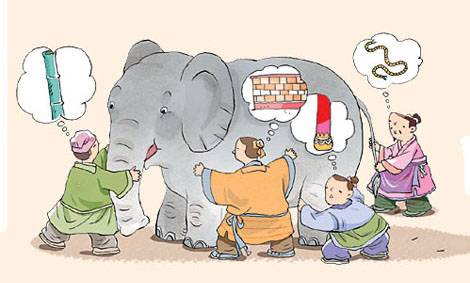 “瞎子摸象”即认为一个总体的组成部分所具有的特性,对于这个总体的其它部分也是普适的。很多时候,对于一个组成部分存在合理性的事物,对于其它组成部分并不具有合理性。我们常能观察到事物之间的一致性,所以当一致性不存在的时候也会主观的认为有一致性。